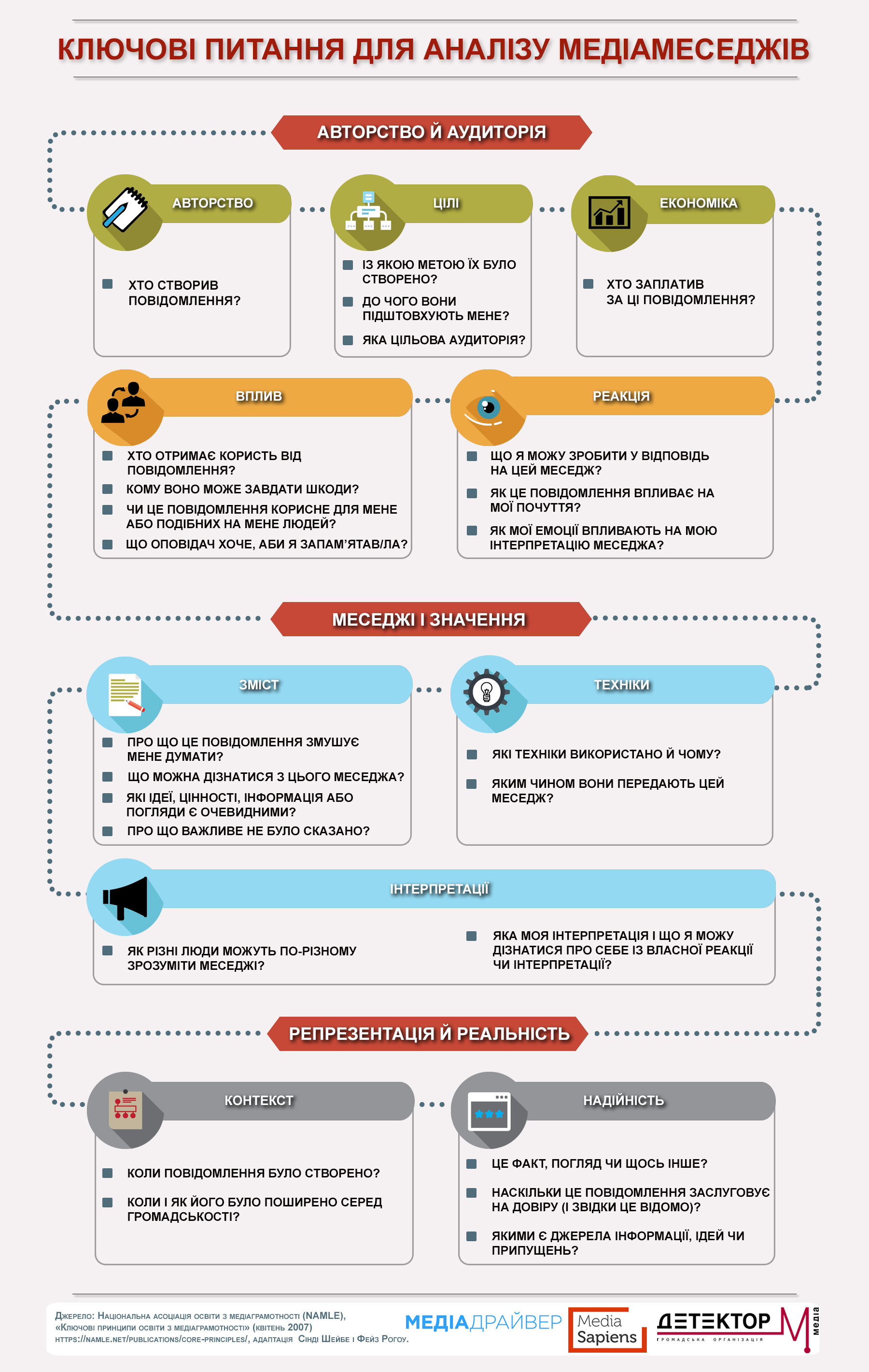 Ці питання відображені у таблиці, розробленій Національною асоціацією освітою з медіаграмотності (NAMLE) у 2007 році.  Нижче опубліковано переклад питань.