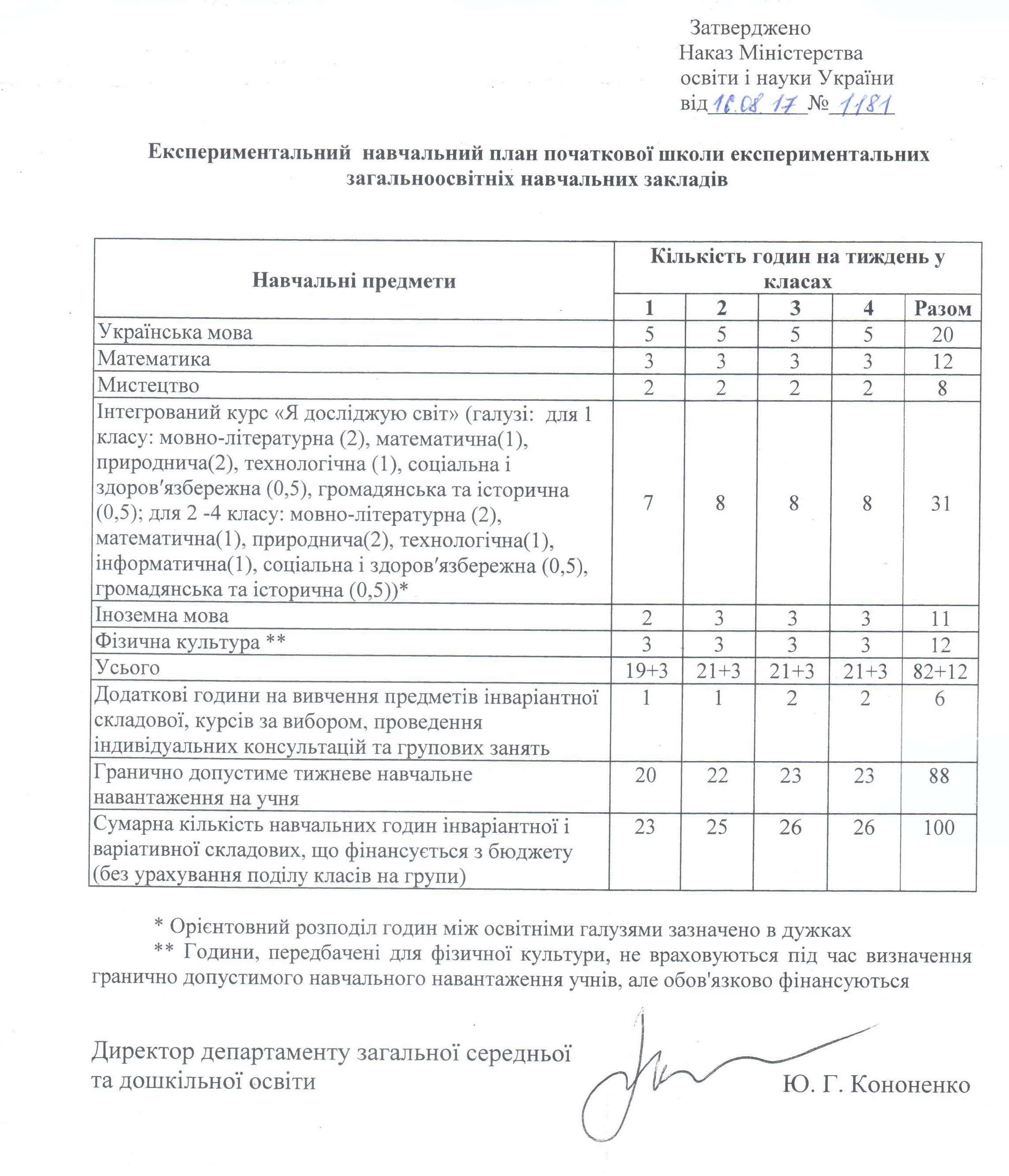 "Про затвердження експериментального навчального плану початкової школи експериментальних загальноосвітніх навчальних закладів, які працюють в межах дослідно-експериментальної роботи всеукраїнського рівня за темою “Розроблення і впровадження навчально-методичного забезпечення початкової освіти в умовах реалізації нового Державного стандарту початкової загальної освіти”"